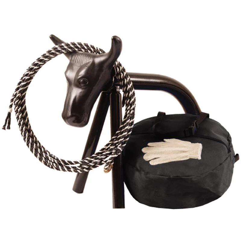 NRS Lets Go Roping Black Mini Steer Head Rope Kit includes one 21″ diameter bag with outside zipper pocket and web handles, one junior steer head with 11.5″ horn spread (metal spikes included), one junior steer head stand (27″ long & 14″ tall), one 5/16″ x 20’ medium lay nylon rope with rawhide burner and one cotton roping glove.